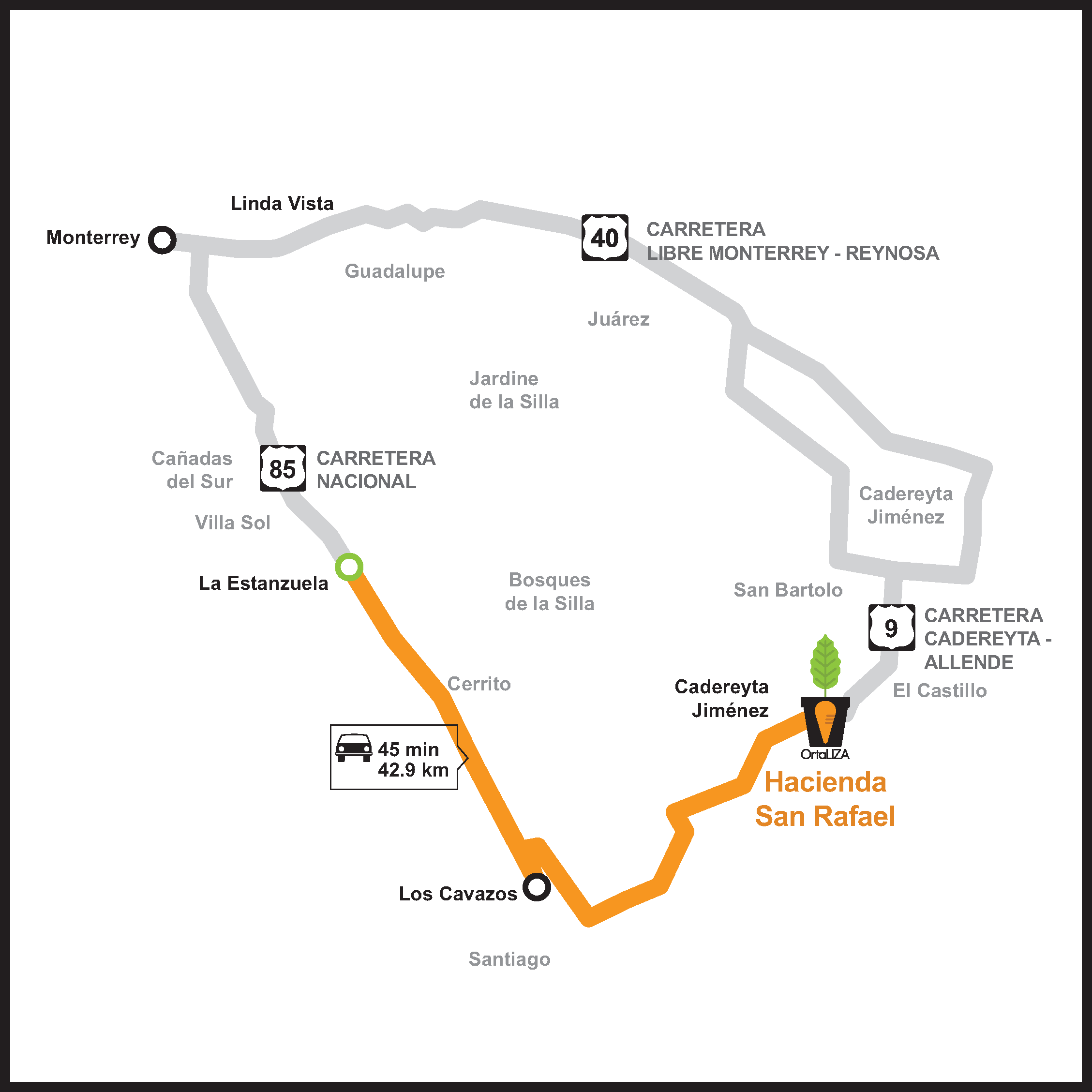 - Tiempo estimado de carretera para llegar a la Hacienda es de 45 min saliendo de la Estanzuela.